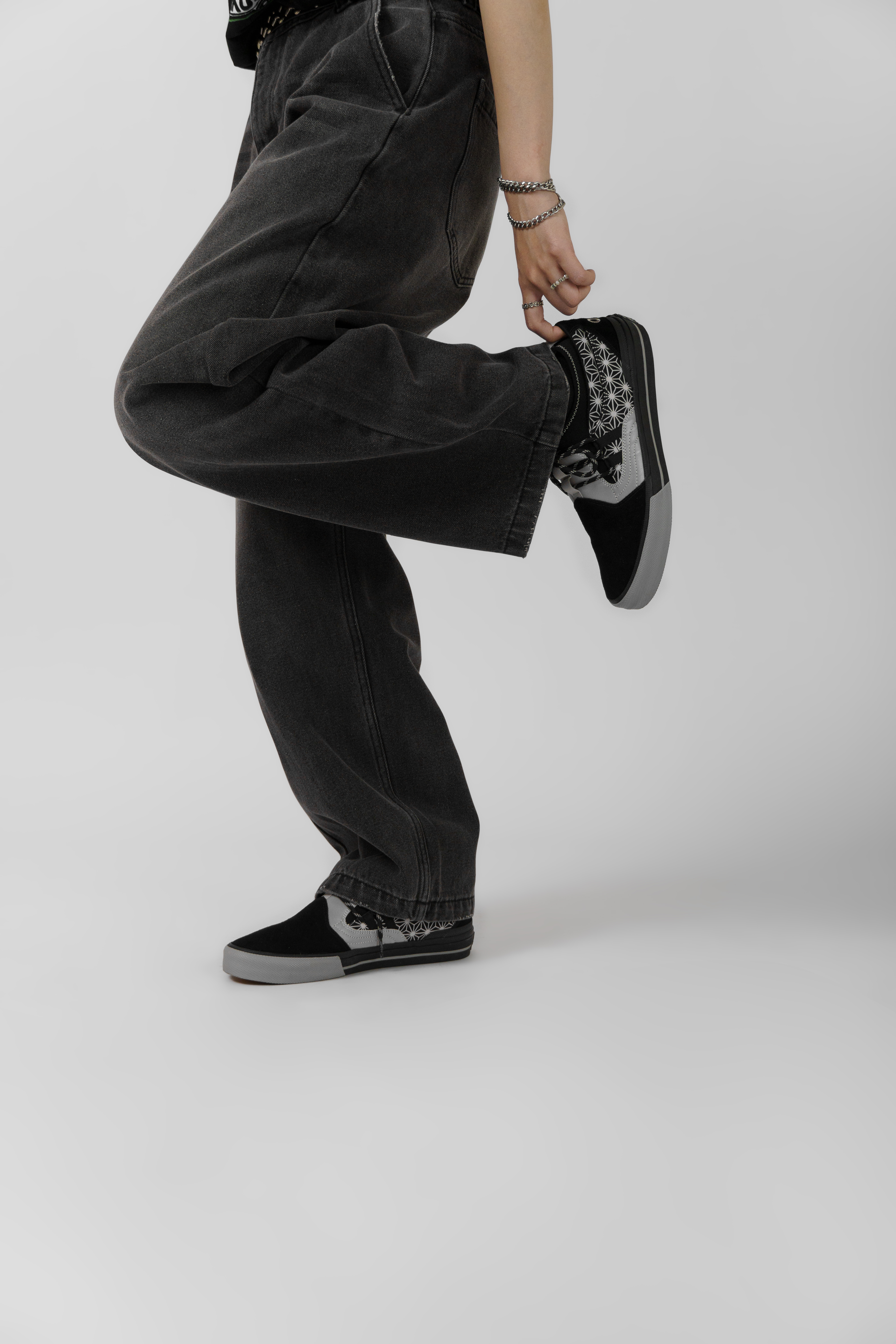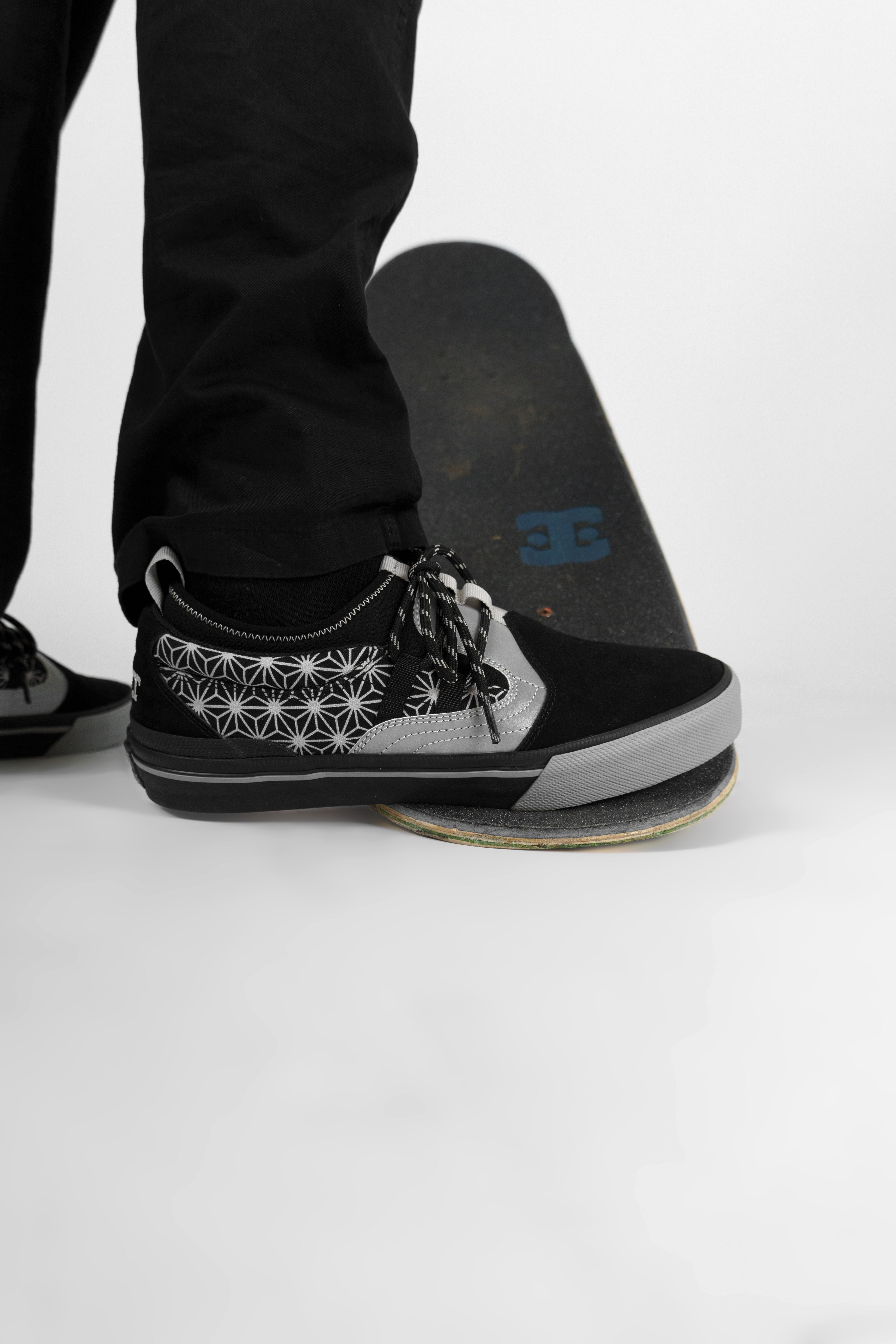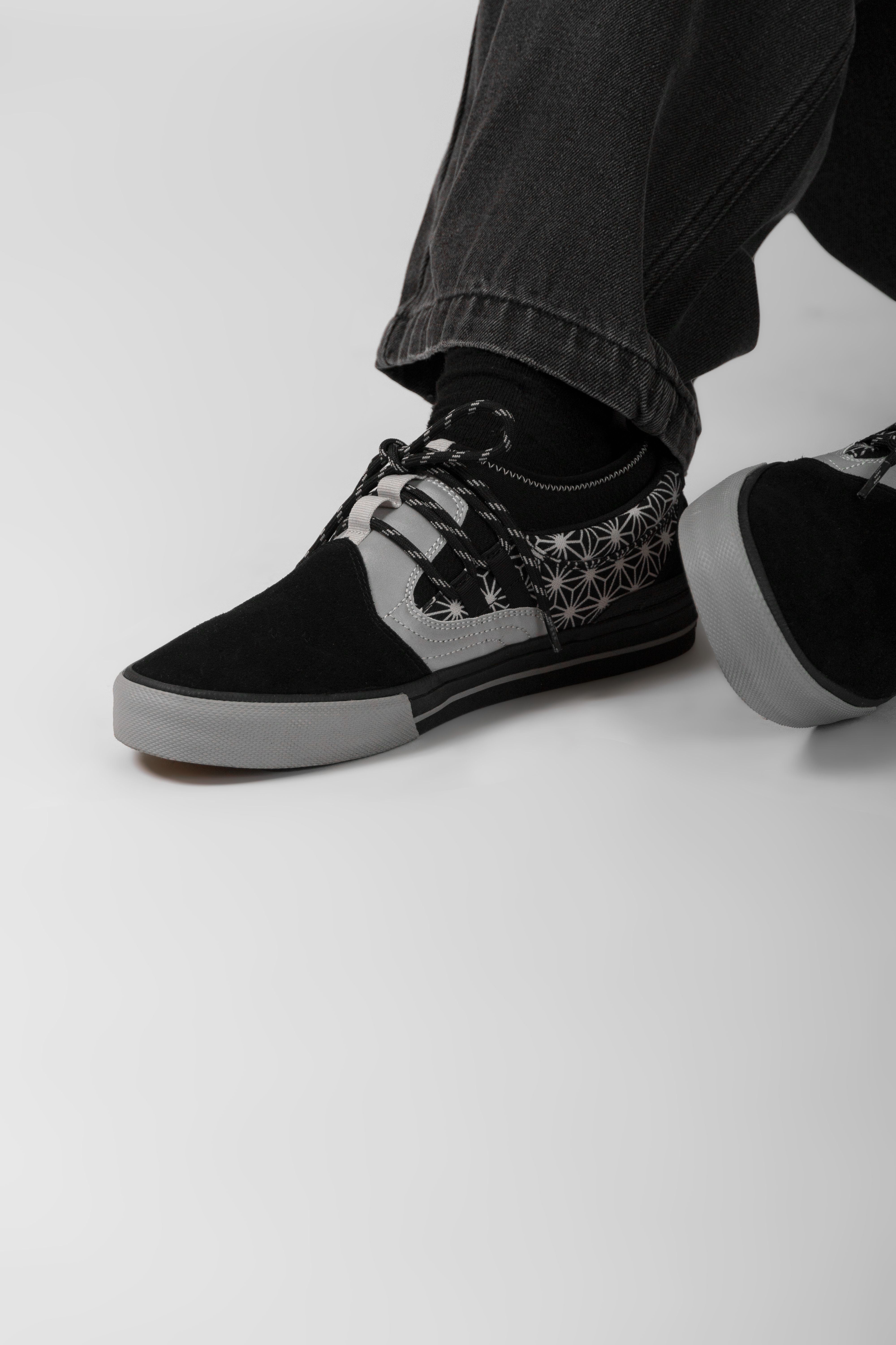 本次聯名鞋款以鐵銀色勾勒金屬3M反光質感,搭配神祕的生命之花圖騰鞋身,呈現出冷冽凝視的獨立態度
